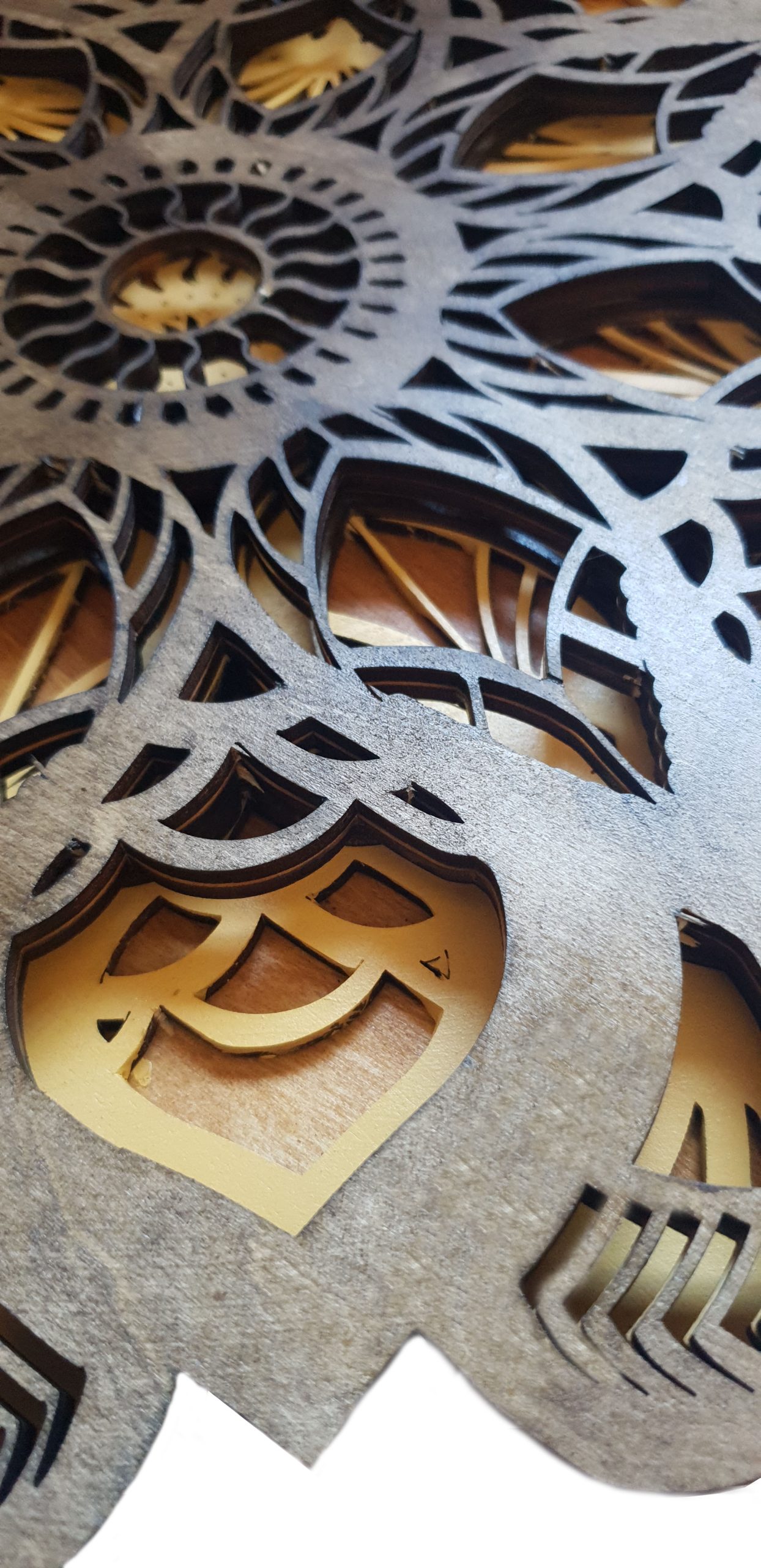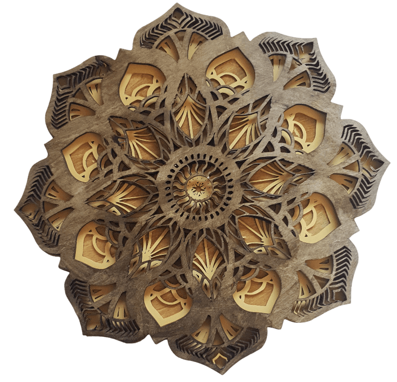 Los mandalas por capas de madera combinan estos dos elementos al crear mandalas en relieve a partir de capas de madera superpuestas. El diseño mandálico se divide en capas concéntricas, y cada capa de madera se corta o graba con un patrón específico. Cuando se apilan las capas, se crea una obra de arte en tres dimensiones con un aspecto tridimensional y texturizado.