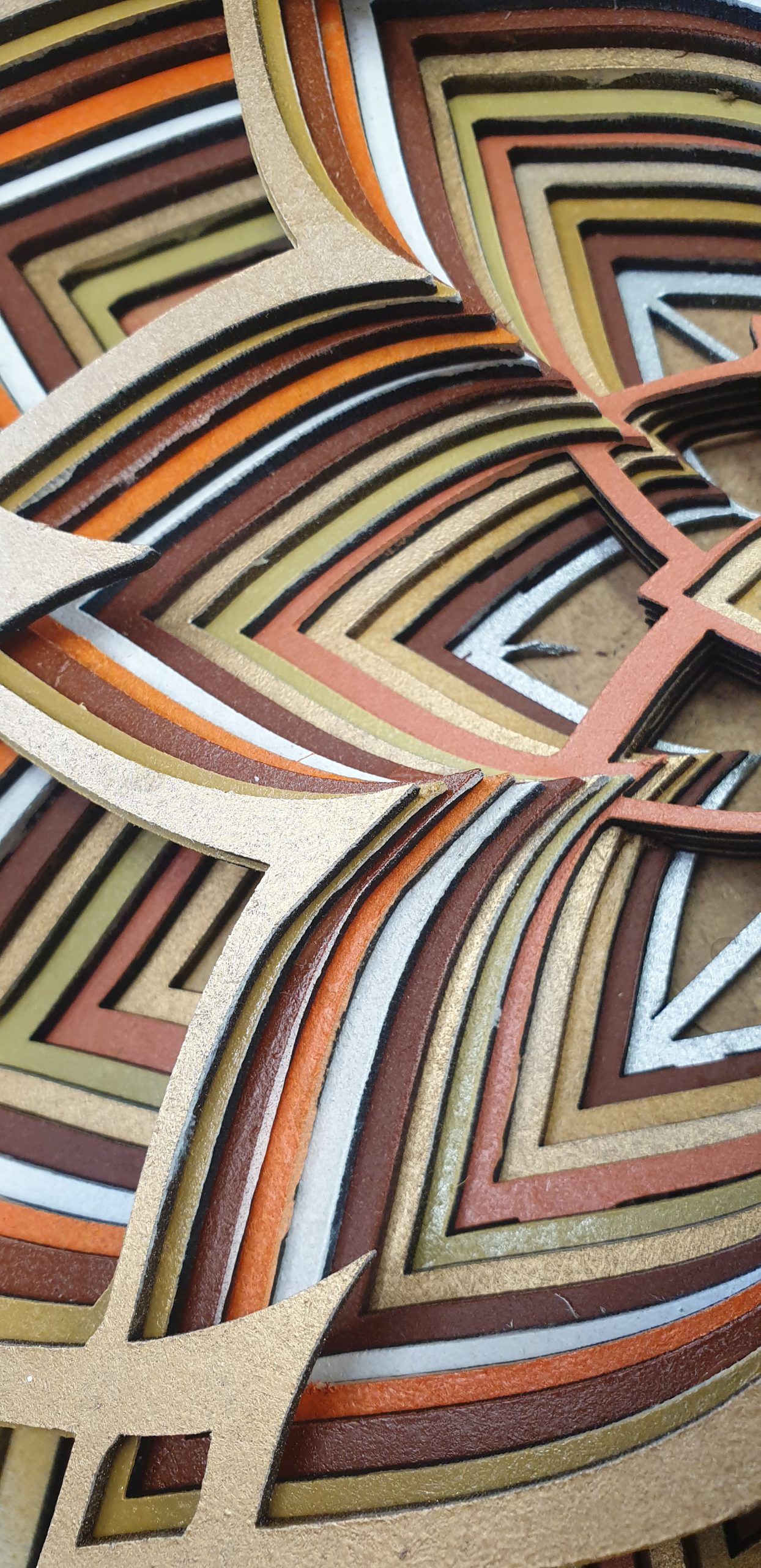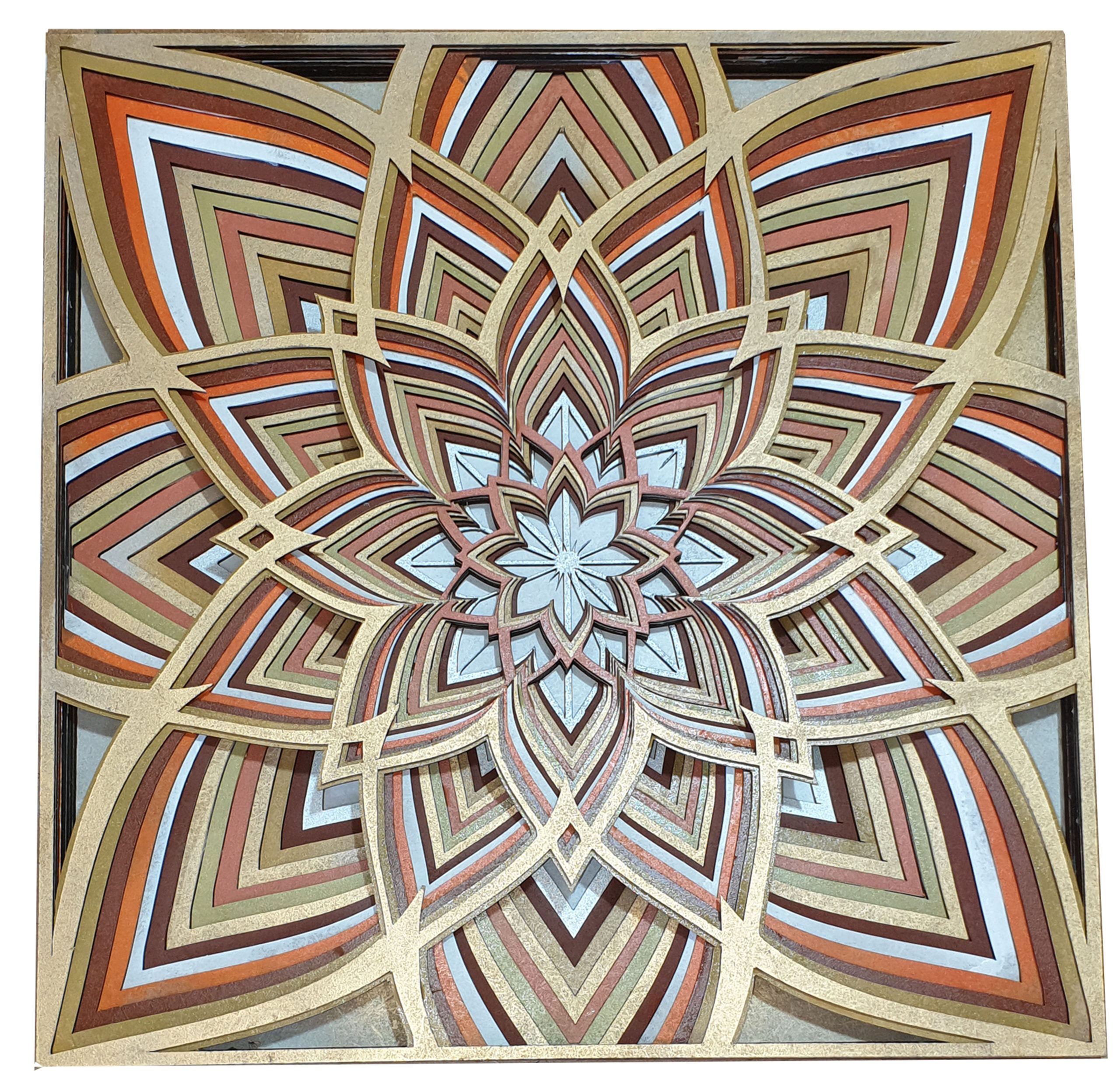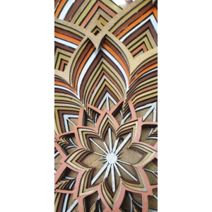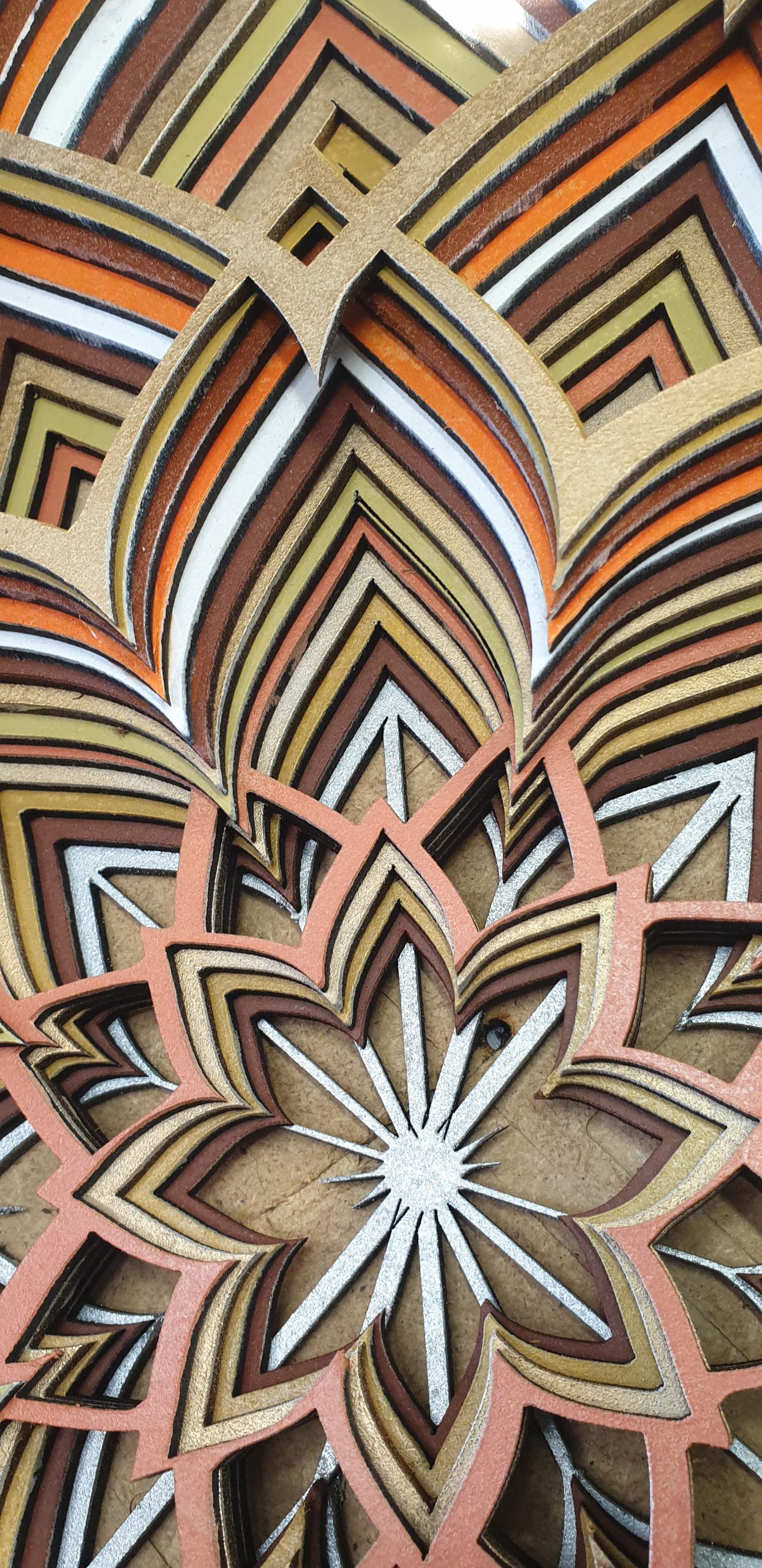 Mándala de madera multicapa, diámetro 38cm.  Los mándalas por capas de madera son una forma de arte y diseño. Los mándalas son patrones geométricos o artísticos que tienen sus raíces en tradiciones espirituales y culturales de todo el mundo.