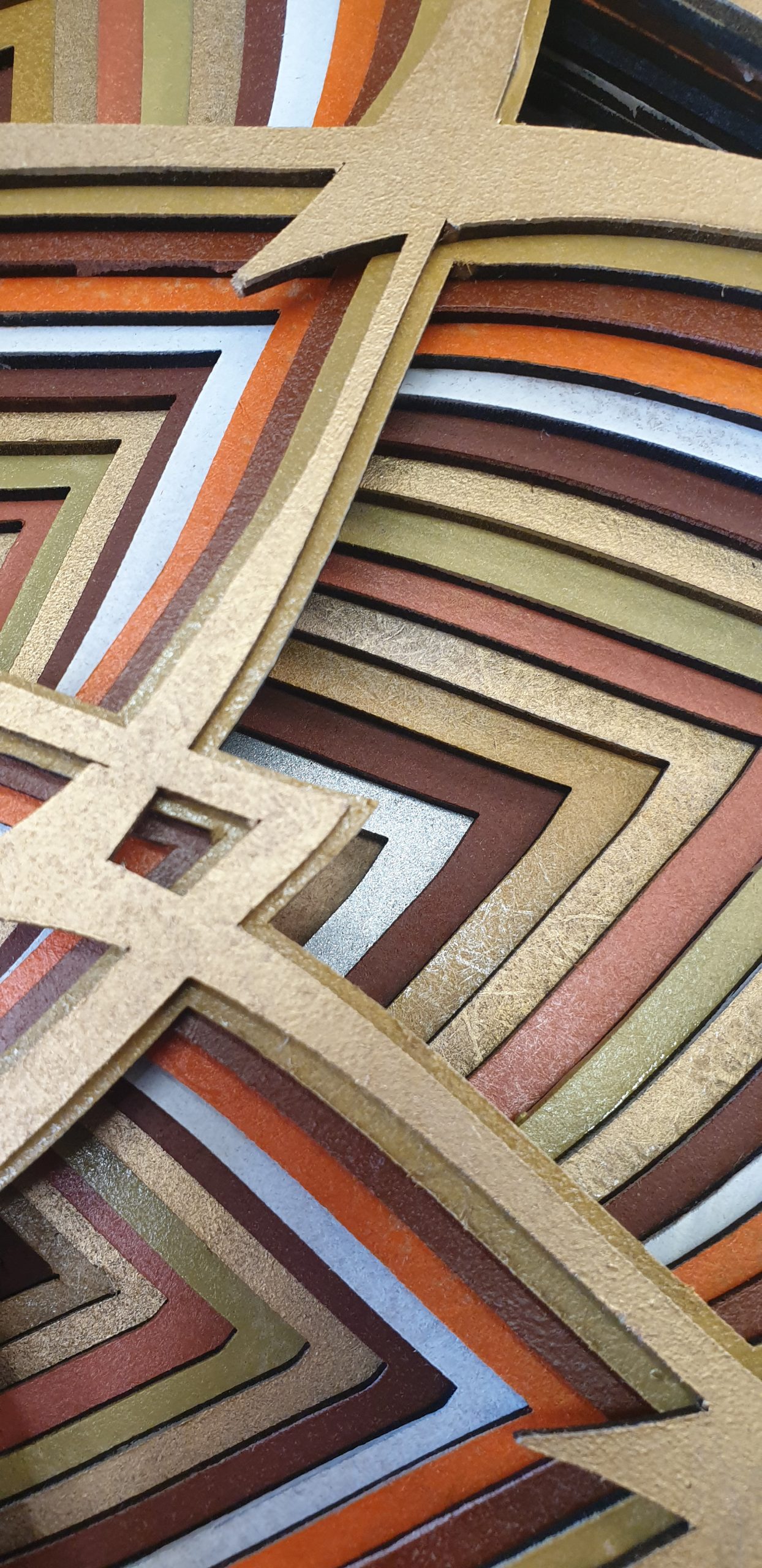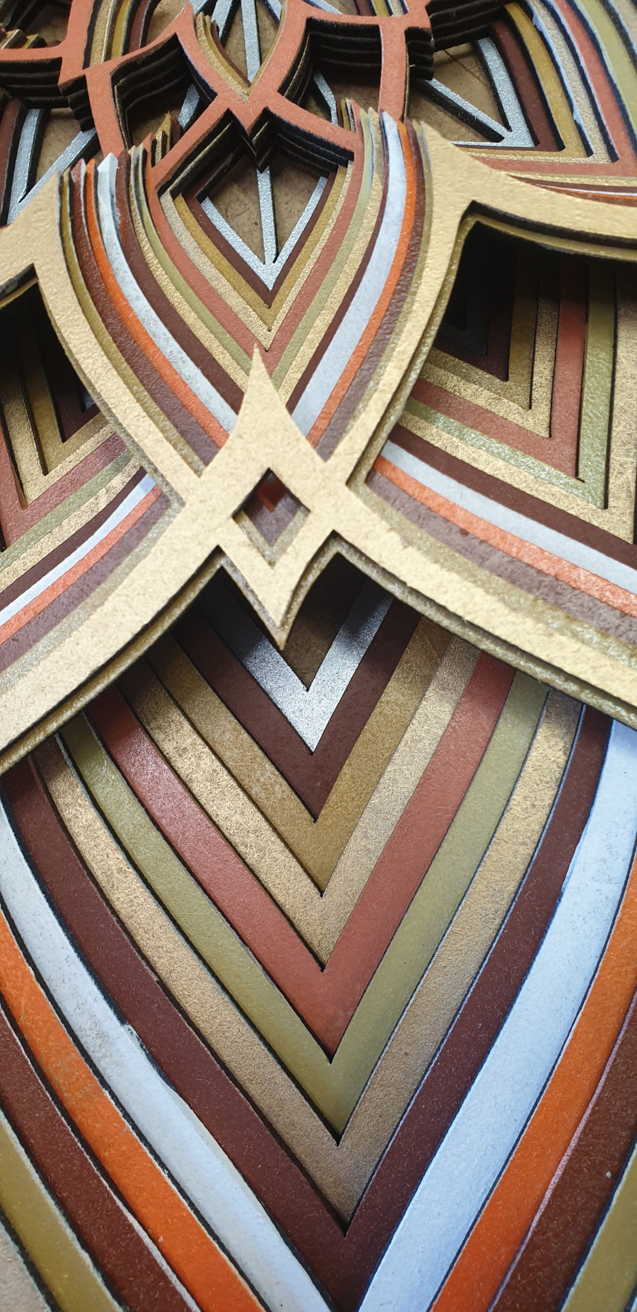 Estas capas están apiladas unas sobre otras para crear diseños en relieve tridimensionales.