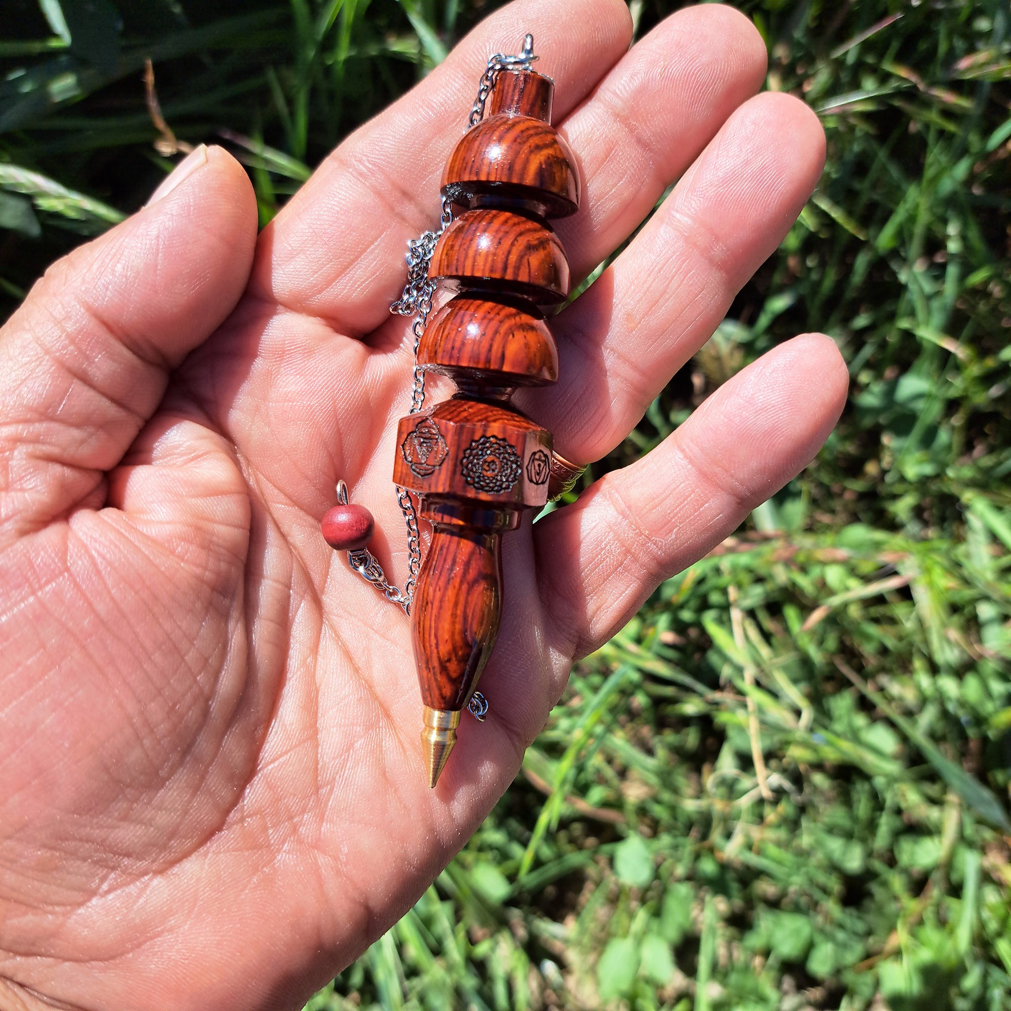 - Simplicidad y Elegancia: Los péndulos de madera suelen tener un diseño simple pero elegante, que puede incluir grabados o incrustaciones de los símbolos de los chakras. La simplicidad del diseño permite que la energía fluya sin obstrucciones.